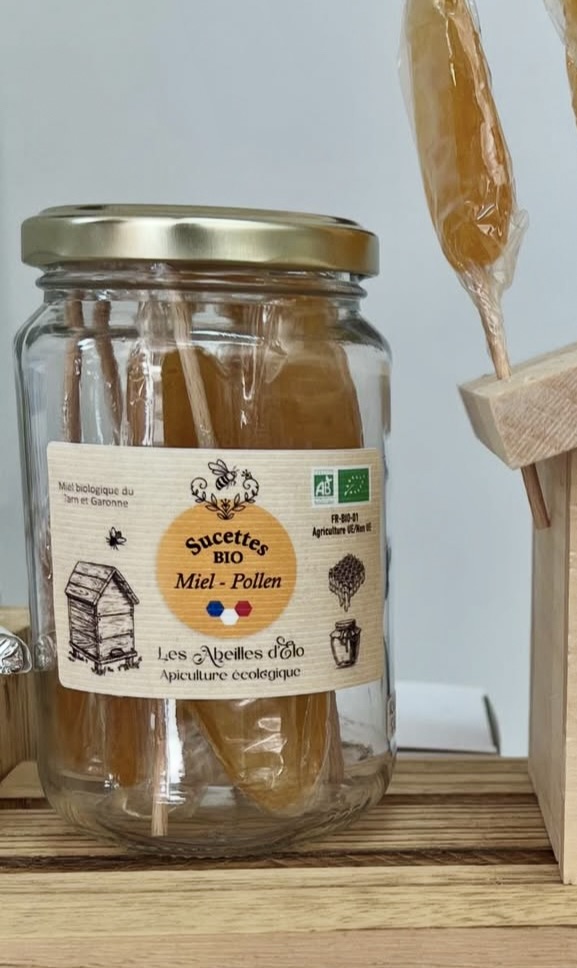 Sucettes artisanales à l’ancienne labellisées AB au miel et au pollen des Abeilles d’Elo.